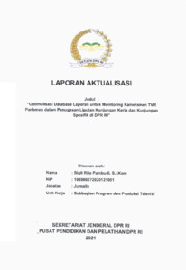 Pambudi, Sigit Rilo (2021) Optimalisasi Database Laporan untuk Monitoring Kameramen TVR Parlemen dalam Penugasan Liputan Kunjungan Kerja dan Kunjungan Spesifik di DPR RI. Project Report. Dewan Perwakilan Rakyat Republik Indonesia, Jakarta.