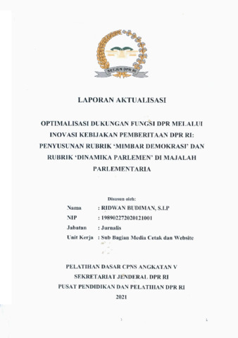 Dokumen ini merupakan Laporan Aktualisasi Pelatihan Dasar CPNS pada Biro Pemberitaan Parlemen, Sekretariat Jenderal DPR RI. Aktualisasi ini berfokus pada optimalisasi dukungan fungsi DPR melalui inovasi kebijakan pemberitaan berupa penyusunan rubrik “Mimbar Demokrasi” dan “Dinamika Parlemen” dalam Majalah Parlementaria. Permasalahan awal terletak pada belum optimalnya penyajian informasi parlemen dalam format majalah yang mampu memperkuat fungsi legislasi, pengawasan, dan anggaran. Melalui kegiatan aktualisasi ini, dilakukan identifikasi kebutuhan pemberitaan, pengumpulan data, wawancara, penulisan naskah rubrik, penyelarasan dengan tim editor, serta validasi oleh mentor. Dokumen ini memuat tahapan pelaksanaan aktualisasi, hasil implementasi berupa rubrik baru dalam majalah, serta evaluasi manfaatnya bagi peningkatan kualitas informasi dan edukasi publik mengenai parlemen.