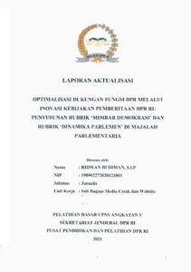 OPTIMALISASI DUKUNGAN FUNGSI DPR MELALUI INOVASI KEBIJAKAN PEMBERITAAN DPR RI PENYUSUNAN RUBRIK MIMBAR DEMOKRASI DAN RUBRIK DINAMIKA PARLEMEN DI MAJALAH PARLEMENTARIA.pdf - Published Version