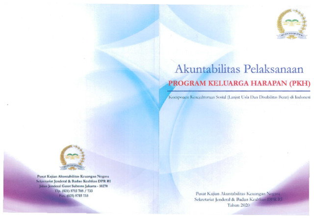 Zakiah, Kiki, Lestari, Vita Puji and Putra, Hafiz Dwi (2020) Akuntabilitas Pelaksanaan Program Keluarga Harapan (PKH): Komponen Kesejahteraan Sosial (Lanjut Usia dan Disabilitas Berat) di Indonesia. Working Paper. PUSAT KAJIAN AKUNTABILITAS KEUANGAN NEGARA BADAN KEAHLIAN DPR RI, Jakarta.
