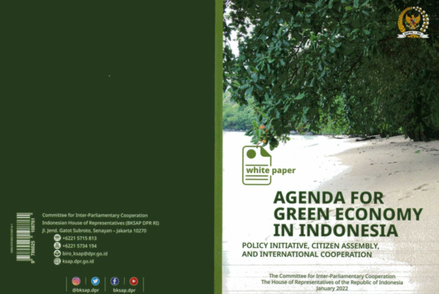 This White Paper discusses Indonesia's strategic agenda in driving the transition to a green economy through three main approaches: policy initiatives, citizen assemblies, and international cooperation. This document outlines the urgency of reorienting development towards a green economy to meet the Paris Agreement commitments, NDC targets, and the long-term LTS-LCCR 2050 strategy. The discussion includes simulations of low-carbon policies (LCDI), structural challenges in energy and land use governance, the impact of the COVID-19 pandemic on development priorities, and the need for institutional reforms to ensure cross-sectoral coordination. This White Paper also proposes the establishment of a Citizen Assembly as a public deliberative mechanism to strengthen the legitimacy of green economy policies, and encourages parliamentary involvement in global, regional, and national cooperation on climate finance, technology transfer, and parliamentary diplomacy. This document serves as a conceptual guide for the Indonesian House of Representatives (DPR RI) in mainstreaming a green economy in national policy.