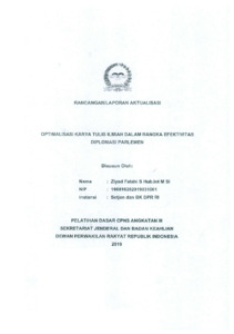 Dokumen ini merupakan Laporan Aktualisasi Pelatihan Dasar CPNS Tahun 2019 yang disusun oleh peneliti pada Pusat Penelitian Badan Keahlian DPR RI. Aktualisasi ini bertujuan mengoptimalkan kontribusi karya tulis ilmiah dalam mendukung efektivitas diplomasi parlemen melalui penyusunan working paper yang relevan dengan kebutuhan Biro Kerja Sama Antar Parlemen (BKSAP). Permasalahan yang diangkat meliputi belum tersedianya karya tulis ilmiah yang sesuai kebutuhan diplomasi parlemen, belum optimalnya kemitraan antara peneliti dan Tenaga Ahli BKSAP, serta belum adanya penggunaan working paper sebagai acuan substansi diplomasi. Implementasi kegiatan meliputi konsultasi dengan mentor, diskusi dengan tenaga ahli, pengumpulan bahan penelitian, penulisan dan pematangan konsep working paper, serta presentasi hasil kepada pimpinan. Laporan menunjukkan bahwa penyusunan working paper mampu memperkuat sinergi peneliti–TA, meningkatkan kualitas bahan diplomasi, serta mendukung profesionalisme dan efektivitas diplomasi parlemen.