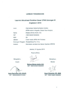 Dokumen ini merupakan laporan Aktualisasi Pelatihan Dasar CPNS Golongan III Angkatan II Tahun 2019 yang disusun oleh Calon Analis APBN Ahli Pertama di Pusat Kajian Anggaran, Sekretariat Jenderal dan Badan Keahlian DPR RI. Aktualisasi ini berfokus pada optimalisasi kebermanfaatan Analisis Ringkas Cepat (ARC) APBN melalui penyusunan Infografis Critical View Analysis sebagai produk komplementer untuk meningkatkan pemahaman Anggota DPR RI terhadap isu-isu strategis APBN. Permasalahan yang diidentifikasi meliputi rendahnya minat baca Anggota DPR RI terhadap produk kajian, belum optimalnya penyajian analisis dalam bentuk visual, serta belum bakunya pendekatan/model analisis untuk proyeksi indikator ekonomi makro. Kegiatan aktualisasi meliputi konsultasi dengan pimpinan, pengumpulan data kuantitatif dan kualitatif, penyusunan substansi analisis, pembuatan infografis, sosialisasi internal, serta evaluasi produk. Laporan ini menunjukkan bahwa infografis sebagai bentuk penyajian visual mampu meningkatkan kejelasan pesan, memperkuat kebermanfaatan analisis APBN, serta menstimulasi keaktifan Anggota Badan Anggaran dalam menjalankan fungsi anggaran dan pengawasan.