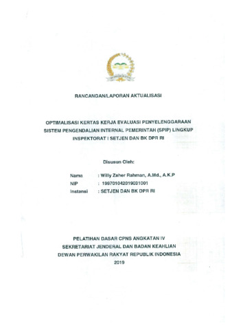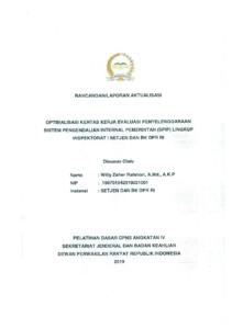 Dokumen ini merupakan Laporan Aktualisasi Pelatihan Dasar CPNS Tahun 2021 yang disusun oleh pelaksana pada Inspektorat I Sekretariat Jenderal dan Badan Keahlian DPR RI. Aktualisasi ini berfokus pada optimalisasi kertas kerja untuk evaluasi penyelenggaraan Sistem Pengendalian Internal Pemerintah (SPIP). Permasalahan utama yang diidentifikasi adalah belum tersedianya kertas kerja evaluasi SPIP yang terstandar sehingga menyulitkan proses reviu, asesmen risiko, serta pemenuhan ketentuan Peraturan BPKP terkait penilaian maturitas SPIP. Melalui rangkaian kegiatan diskusi, pengumpulan dokumen, penyusunan format, uji coba, dan bimbingan dengan auditor serta analis, aktualisasi menghasilkan kertas kerja evaluasi SPIP yang lebih sistematis, komprehensif, dan terintegrasi dengan kebutuhan Inspektorat I. Laporan juga memuat bukti implementasi, evaluasi, serta rekomendasi penerapan format kertas kerja sebagai standar kerja di lingkungan Inspektorat I.