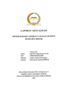 Dokumen ini merupakan Laporan Aktualisasi Pelatihan Dasar CPNS Tahun 2021 yang berfokus pada optimalisasi laporan capaian output di Sekretariat Jenderal DPR RI. Laporan menyoroti permasalahan utama berupa ketidakoptimalan pengisian capaian output, kurangnya pemahaman unit kerja, kesadaran pelaporan yang masih rendah, belum adanya pedoman teknis, serta seringnya perubahan kebijakan dari Kementerian Keuangan. Melalui rangkaian kegiatan koordinasi dengan mentor, penggalangan dukungan pimpinan, survei dan kuisioner terhadap staf PPK, penyusunan ebook pedoman capaian output, pembuatan ebanner kampanye, serta sosialisasi, aktualisasi ini menghasilkan panduan praktis dan media edukatif yang membantu meningkatkan akurasi, akuntabilitas, dan ketepatan waktu pelaporan capaian output. Laporan memuat analisis isu, rencana kegiatan, dokumentasi implementasi, serta dampak bagi individu, unit kerja, dan organisasi.