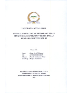 Dokumen ini merupakan Laporan Aktualisasi Pelatihan Dasar CPNS Tahun 2021 yang dilaksanakan di Bagian Kendaraan, Biro Umum, Sekretariat Jenderal DPR RI. Aktualisasi ini berfokus pada optimalisasi layanan kendaraan dinas melalui pembentukan Call Center sebagai pusat informasi dan layanan terintegrasi bagi seluruh pegawai Setjen DPR RI. Permasalahan utama yang diidentifikasi meliputi belum optimalnya penerimaan telepon layanan kendaraan, tidak adanya standar tata cara komunikasi, belum adanya konsistensi rujukan informasi antar pegawai, serta tidak terpadunya kanal layanan kendaraan dinas. Melalui diskusi awal, penyusunan petunjuk layanan, pembuatan jadwal petugas call center, penyediaan stiker informasi, implementasi briefing, hingga evaluasi dampak, aktualisasi menghasilkan layanan call center yang lebih responsif, sopan, terstandar, dan akuntabel. Dampak positif juga terlihat pada peningkatan koordinasi internal, kecepatan pelayanan, serta profesionalisme pegawai dalam memberikan layanan kendaraan.
