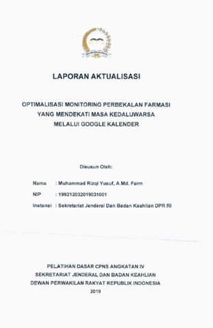 Dokumen ini merupakan Laporan Aktualisasi Pelatihan Dasar CPNS Tahun 2021 pada Subbagian Farmasi, Bagian Layanan Kesehatan, Biro Umum, Sekretariat Jenderal DPR RI. Permasalahan utama adalah belum optimalnya monitoring perbekalan farmasi yang mendekati masa kedaluwarsa akibat keterbatasan pencatatan manual, tidak adanya pengingat otomatis, serta lemahnya koordinasi jadwal pengecekan stok. Aktualisasi ini menawarkan solusi dengan mengintegrasikan sistem pengingat melalui Google Kalender untuk memonitor tanggal kedaluwarsa obat dan perbekalan farmasi. Kegiatan yang dilakukan meliputi identifikasi masalah, penyusunan alur sistem, input data stok ke dalam kalender, pelatihan internal, hingga evaluasi implementasi. Hasil aktualisasi menunjukkan peningkatan efisiensi pengawasan, ketepatan waktu tindakan preventif, serta peningkatan akuntabilitas dalam pengelolaan perbekalan farmasi di lingkungan Bagian Layanan Kesehatan.