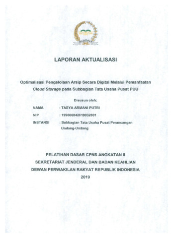 Dokumen ini merupakan Laporan Aktualisasi Pelatihan Dasar CPNS Tahun 2021 pada Subbagian Tata Usaha Pusat PUU, Sekretariat Jenderal DPR RI. Laporan ini berfokus pada optimalisasi pengelolaan arsip digital melalui pemanfaatan Cloud Storage DPR sebagai solusi penyimpanan dokumen yang lebih teratur, aman, dan mudah diakses. Permasalahan yang diidentifikasi meliputi penumpukan arsip fisik, sulitnya pencarian dokumen, belum adanya standar penamaan arsip digital, serta keterbatasan media penyimpanan. Kegiatan aktualisasi meliputi identifikasi arsip, penyusunan struktur folder, scanning dokumen, pengunggahan arsip ke cloud, penyusunan juknis pengarsipan, serta evaluasi efektivitas implementasi. Hasilnya meningkatkan kerapihan arsip, mempercepat proses pencarian dokumen, dan mendukung tata kelola administrasi berbasis digital di Pusat PUU.