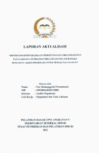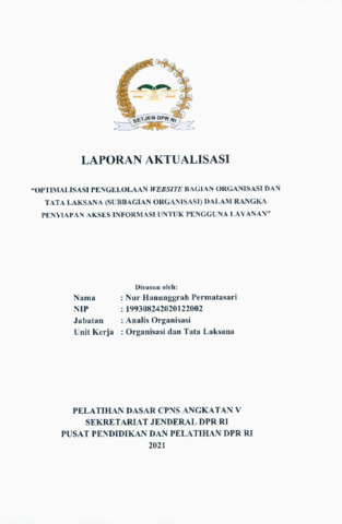 Dokumen ini merupakan Laporan Aktualisasi Pelatihan Dasar CPNS Tahun 2021 yang dilaksanakan pada Subbagian Organisasi, Bagian Organisasi dan Tata Laksana, Biro Perencanaan dan Organisasi, Sekretariat Jenderal DPR RI. Laporan ini mengangkat isu belum optimalnya pengelolaan website Bagian Organisasi dan Tata Laksana yang menyebabkan informasi layanan tidak tersaji dengan baik bagi pengguna. Melalui rangkaian kegiatan seperti identifikasi kebutuhan informasi, pengumpulan data kegiatan, perbaikan konten website, penyesuaian struktur tampilan, penyusunan pedoman konten, hingga monitoring dan evaluasi, aktualisasi ini menghasilkan tampilan website yang lebih informatif, mudah diakses, dan memenuhi kebutuhan publik internal maupun eksternal. Peningkatan kualitas website tersebut mendukung transparansi, akuntabilitas, dan efektivitas layanan Bagian Organisasi.