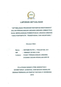 Dokumen ini merupakan Laporan Aktualisasi Pelatihan Dasar CPNS Tahun 2019 yang dilaksanakan di Pusat Perancangan Undang-Undang (PUU) Badan Keahlian DPR RI. Laporan ini membahas optimalisasi program Sistem Informasi Partisipasi Masyarakat (SIMAS PUU) sebagai sarana untuk meningkatkan partisipasi publik dalam proses penyusunan Naskah Akademik (NA) dan Rancangan Undang–Undang (RUU). Permasalahan utama yang diangkat adalah rendahnya pemanfaatan SIMAS PUU, kurangnya sosialisasi ke masyarakat, serta belum optimalnya integrasi masukan publik ke dalam penyusunan NA dan RUU. Melalui kegiatan identifikasi isu, penyusunan materi sosialisasi, perbaikan alur kerja, pelaksanaan sosialisasi, dan evaluasi, proyek aktualisasi ini diharapkan meningkatkan transparansi, akuntabilitas, serta partisipasi masyarakat dalam proses legislasi, sekaligus mendukung penerapan prinsip Open Parliament.