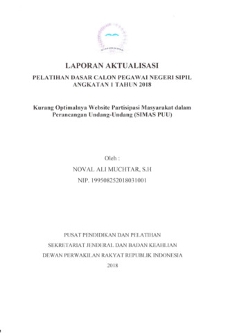 Laporan Aktualisasi Pelatihan Dasar CPNS ini mengangkat isu kurang optimalnya penggunaan Website Partisipasi Masyarakat dalam Perancangan Undang-Undang (SIMAS PUU) sebagai sarana penyampaian aspirasi publik kepada DPR RI. Berdasarkan isi laporan, masalah muncul karena rendahnya tingkat partisipasi, kurangnya pemahaman publik terhadap fitur SIMAS PUU, tampilan antarmuka yang belum ramah pengguna, serta minimnya sosialisasi. Laporan memaparkan analisis kondisi eksisting, nilai-nilai dasar ASN, landasan hukum partisipasi publik, tahapan kegiatan aktualisasi seperti penyusunan panduan penggunaan SIMAS PUU, pelatihan internal, perbaikan alur informasi, dan sosialisasi kepada pengguna. Lampiran mencakup dokumentasi kegiatan, lembar evaluasi, notulensi, dan rencana tindak lanjut. Program ini bertujuan meningkatkan efektivitas SIMAS PUU sebagai kanal resmi penjaringan aspirasi publik dalam proses legislasi.