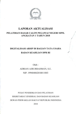 Laporan ini berisi proses aktualisasi CPNS yang dilakukan dalam bentuk kegiatan digitalisasi arsip pada Bagian Tata Usaha Badan Keahlian DPR RI. Aktivitas meliputi perencanaan digitalisasi arsip, pemilahan berkas fisik, scanning, pengolahan hasil scan, pemberian identitas file, penyusunan database arsip, hingga sosialisasi dan evaluasi kepada seluruh jajaran Tata Usaha. Kegiatan ini bertujuan untuk meningkatkan efisiensi pengarsipan, memudahkan pencarian dokumen, serta mendukung tugas administrasi perencanaan, keuangan, kepegawaian, umum, dan pelaporan di Badan Keahlian DPR RI. Laporan juga menggambarkan penerapan nilai-nilai dasar ASN (Religius, Akuntabel, Profesional, Integritas) dalam seluruh tahapan kegiatan.
