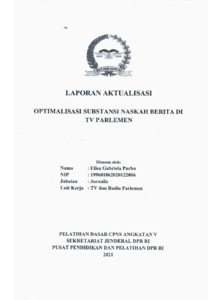 Dokumen ini merupakan Laporan Aktualisasi Pelatihan Dasar CPNS Tahun 2019 pada Bagian Televisi dan Radio Parlemen, Biro Pemberitaan Parlemen, Deputi Bidang Persidangan DPR RI. Laporan ini mengangkat isu belum optimalnya substansi naskah berita di TV Parlemen, terutama terkait akurasi informasi, kesesuaian dengan pedoman jurnalistik, dan keseragaman struktur penulisan. Penyusun merumuskan solusi berupa penyusunan pedoman penulisan naskah berita, perbaikan alur editorial, serta pelaksanaan supervisi berjenjang untuk naskah berita. Implementasi dilakukan melalui identifikasi kebutuhan, penyusunan standar penulisan, konsultasi dengan produser dan redaksi, uji coba penyusunan naskah, serta evaluasi hasil. Aktualisasi ini menghasilkan perbaikan kualitas naskah berita, peningkatan akurasi substansi, dan konsistensi standar penulisan berita di TV Parlemen.