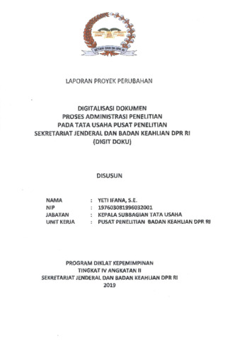 Dokumen ini menyajikan laporan lengkap proyek perubahan yang berfokus pada digitalisasi dokumen proses administrasi penelitian di Subbagian Tata Usaha Pusat Penelitian Setjen dan BK DPR RI. Proyek ini menghasilkan aplikasi DIGIT DOKU, Standar Operasional Prosedur (SOP) administrasi penelitian, proses scanner dan klasifikasi dokumen, penginputan dokumen ke Portal Pegawai & Peneliti, serta kegiatan bimbingan teknis dan sosialisasi kepada para peneliti dan stakeholder. Digitalisasi ini bertujuan meningkatkan efektivitas pengelolaan dokumen, mempercepat pencarian arsip, mendukung penyediaan dokumen penelitian secara digital, serta memperkuat integrasi sistem data penelitian (SDIP). Laporan ini juga menggambarkan tahapan jangka pendek, menengah, dan panjang serta dukungan berbagai unit di lingkungan Badan Keahlian.