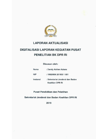 Azkara, Dandy Adrian (2019) Digitalisasi laporan kegiatan Pusat Penelitian BK DPR RI. Project Report. Pusat Pendidikan dan Pelatihan Setjen DPR RI, Jakarta.