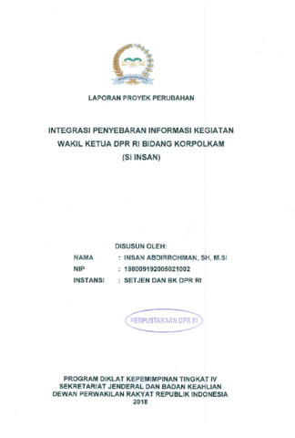 Abdirrohman, Insan (2018) Integrasi penyebaran informasi kegiatan Wakil Ketua DPR RI Bidang Korpolkam (SI INSAN). Project Report. Sekretariat Jenderal dan Badan Keahlian DPR RI, Jakarta.