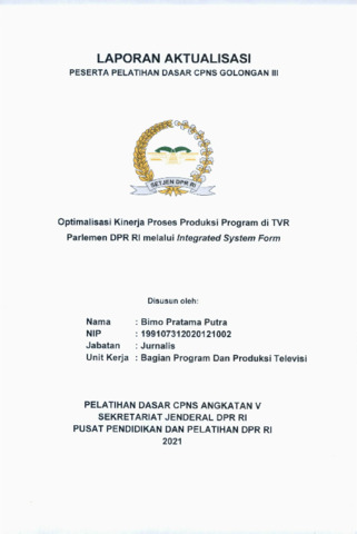 Dokumen ini merupakan Laporan Aktualisasi Pelatihan Dasar CPNS yang dilaksanakan di Bagian Televisi dan Radio Parlemen, Biro Pemberitaan Parlemen, Sekretariat Jenderal DPR RI. Laporan ini mengangkat isu belum optimalnya kinerja proses produksi program di TVR Parlemen akibat belum adanya sistem terintegrasi untuk perencanaan, pelaksanaan, dan evaluasi produksi. Penyusun merumuskan solusi berupa pembuatan dan penerapan Integrated System Form, yang mencakup formulir perencanaan liputan, formulir evaluasi hasil produksi, serta mekanisme pelaporan terpadu menggunakan platform digital. Implementasi dilakukan melalui analisis kebutuhan, penyusunan format form, uji coba penerapan pada beberapa program, serta evaluasi pengguna. Hasilnya menunjukkan peningkatan efektivitas koordinasi, ketepatan alur produksi, serta akurasi dokumentasi kegiatan produksi di TVR Parlemen.