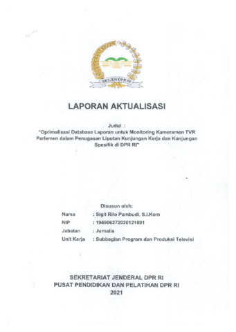 Dokumen ini merupakan Laporan Aktualisasi Pelatihan Dasar CPNS Tahun 2021 pada Bagian Televisi dan Radio Parlemen, Biro Pemberitaan Parlemen, Sekretariat Jenderal DPR RI. Isu utama yang diangkat adalah belum optimalnya monitoring kinerja kameramen dalam penugasan liputan kunjungan kerja (kunker) dan kunjungan spesifik (kunspek). Hal ini disebabkan belum adanya database laporan yang terstruktur, kurangnya dokumentasi evaluasi teknis dan non-teknis, serta absennya sistem pelaporan yang dapat diakses bersama. Aktualisasi ini menghasilkan database laporan berbasis Google Docs yang mencakup data tugas liputan, jumlah berita, kendala, hingga evaluasi teknis. Implementasi dilakukan melalui penyusunan format database, sosialisasi, pengisian berkala, hingga evaluasi efektivitas penggunaan. Sistem ini meningkatkan akuntabilitas, transparansi, dan efektivitas monitoring kinerja kameramen TVR Parlemen.
