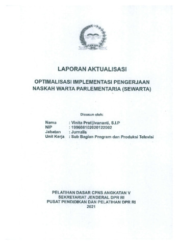 Dokumen ini merupakan Laporan Aktualisasi Pelatihan Dasar CPNS Tahun 2021 yang disusun oleh Vinita Pratijivananti, S.I.P dari Subbagian Program dan Produksi Televisi. Laporan ini mengangkat isu belum optimalnya prosedur pengerjaan naskah Warta Parlementaria (SEWARTA), yang mengakibatkan ketidakterseragaman format penulisan, keterlambatan pengiriman naskah, dan perbedaan informasi antara naskah dan tayangan. Penyusun merancang solusi berupa penyusunan format baku penulisan naskah, penyusunan prosedur/flow pengerjaan naskah, serta penunjukan satuan kerja pendukung sebagai penanggung jawab tambahan. Implementasi dilakukan melalui evaluasi format lama, diskusi dengan tim redaksi dan produksi, finalisasi format dan prosedur, sosialisasi, hingga evaluasi. Hasil aktualisasi menunjukkan peningkatan keseragaman penulisan, ketepatan waktu pengiriman naskah, dan efektivitas koordinasi dalam proses produksi Warta Parlementaria.