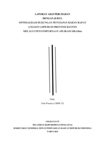 Laporan Aksi Perubahan ini menjelaskan inovasi yang dilakukan dalam rangka optimalisasi dukungan penyiapan bahan rapat Anggota DPD RI di Provinsi Banten melalui penyempurnaan Aplikasi SIKABan (Sistem Informasi Kegiatan Anggota DPD RI Provinsi Banten). Kegiatan ini dilaksanakan untuk mengatasi keterbatasan sarana penyampaian informasi kegiatan dan kinerja Anggota DPD RI yang sebelumnya masih bersifat manual serta belum terintegrasi dengan sistem aspirasi masyarakat. Penyempurnaan dilakukan dengan menambah fitur agenda kegiatan, pembidangan aspirasi, dan tindak lanjut aspirasi agar layanan informasi dan kolaborasi antara Sekretariat Kantor DPD RI, Tenaga Ahli, dan Anggota DPD RI lebih efektif. Hasil implementasi menunjukkan peningkatan transparansi informasi publik, kemudahan pengelolaan data aspirasi masyarakat dan daerah (Asmasda), serta memperkuat akuntabilitas kinerja DPD RI di tingkat provinsi.