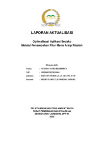 Laporan ini menjelaskan kegiatan aktualisasi berjudul “Optimalisasi Aplikasi Sedako melalui Penambahan Fitur Menu Arsip Risalah” yang bertujuan untuk mendukung pengelolaan arsip risalah secara digital di lingkungan Sekretariat Komite I DPD RI. Permasalahan yang dihadapi adalah belum tersedianya arsip risalah per masa sidang yang terdokumentasi dengan baik dalam aplikasi Sedako (Sistem Elektronik Data Komite). Melalui kegiatan ini, penulis menambahkan fitur folder Arsip Risalah dalam aplikasi Sedako berbasis Nextcloud, membuat subfolder per masa sidang, serta menyusun infografis panduan akses risalah. Proses aktualisasi mencakup koordinasi dengan mentor dan pihak BPSI (Bagian Pemeliharaan Sistem Informasi), pelaksanaan sosialisasi kepada pengguna, serta evaluasi melalui survei daring. Hasil aktualisasi menunjukkan peningkatan aksesibilitas, efisiensi pencarian, dan transparansi arsip risalah, sekaligus memperkuat penerapan nilai ASN BerAKHLAK dan prinsip Smart ASN di lingkungan DPD RI.