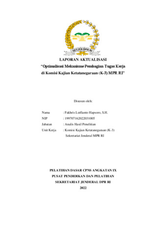 Hapsoro, Fakhris Lutfianto (2022) Optimalisasi Mekanisme Pembagian Tugas Kerja di Komisi Kajian Ketatanegaraan (K-3) MPR RI. Project Report. Pusat Pendidikian dan Pelatihan, Jakarta.
