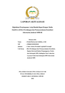 Laporan aktualisasi ini mengangkat isu belum optimalnya pengarsipan risalah rapat dalam sistem digital di Biro Persidangan dan Pemasyarakatan Konstitusi Sekretariat Jenderal MPR RI. Sebelumnya, arsip risalah disimpan secara manual dan tersebar di masing-masing pegawai, menyebabkan duplikasi data, sulitnya temu balik informasi, serta risiko kehilangan arsip. Sebagai solusi, penulis menerapkan digitalisasi penyimpanan arsip risalah menggunakan media OneDrive. Kegiatan meliputi koordinasi dengan mentor dan BSID untuk memastikan keamanan data, pengumpulan arsip risalah sejak amandemen UUD 1945, pembuatan format pengarsipan berbasis tanggal dan subjek, pembuatan database arsip digital, serta sosialisasi penerapan OneDrive kepada pejabat fungsional Perisalah Legislatif dan Asisten Perisalah Legislatif. Hasil penerapan menunjukkan peningkatan efisiensi, keteraturan arsip, kemudahan akses, dan keamanan data yang lebih terjamin. Program ini juga memperkuat nilai-nilai ASN BerAKHLAK serta mendukung terwujudnya tata kelola arsip yang profesional, modern, dan akuntabel di lingkungan Sekretariat Jenderal MPR RI.