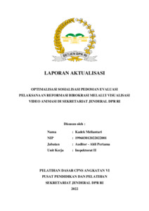 Laporan ini menyajikan kegiatan aktualisasi Kadek Meliantari sebagai CPNS Auditor di Inspektorat II Setjen DPR RI. Isu utama yang diangkat adalah belum optimalnya sosialisasi pedoman evaluasi pelaksanaan Reformasi Birokrasi (RB) kepada unit kerja di lingkungan Sekretariat Jenderal DPR RI. Untuk menjawab isu tersebut, penulis mengembangkan media video animasi (videografis) yang menjelaskan pedoman evaluasi PMPRB (Penilaian Mandiri Pelaksanaan Reformasi Birokrasi) berdasarkan Permenpan RB No. 26 Tahun 2020. Proses aktualisasi dilakukan melalui tahapan diskusi dengan mentor, studi referensi, penyusunan skrip, pembuatan dan revisi video, hingga sosialisasi melalui berbagai kanal digital seperti YouTube, Instagram, Website Inspektorat Utama, dan Portal DPR RI. Evaluasi menunjukkan peningkatan pemahaman pegawai terhadap pedoman evaluasi RB, serta peningkatan efektivitas dan daya tarik kegiatan sosialisasi. Kegiatan ini mendukung pencapaian target nilai RB “AA” sesuai Renstra Sekretariat Jenderal DPR RI 2020–2024 dan merupakan bentuk penerapan nilai ASN BerAKHLAK (Kompeten, Akuntabel, Adaptif, Kolaboratif, dan Berorientasi Pelayanan).