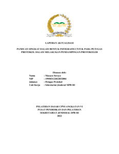 Laporan aktualisasi ini menjelaskan kegiatan penyusunan panduan singkat dalam bentuk infografis sebagai acuan bagi petugas protokol Sekretariat Jenderal MPR RI dalam melakukan pendampingan keprotokoleran kepada pimpinan. Sebelum adanya panduan ini, pegawai baru sering mengalami kebingungan dan ketidakteraturan dalam pelaksanaan tugas karena tidak adanya acuan tertulis. Melalui kegiatan aktualisasi, penulis mengidentifikasi isu tersebut dan merancang panduan praktis berbasis infografis yang memuat langkah-langkah pendampingan protokol mulai dari persiapan, pelaksanaan, hingga penutupan acara. Kegiatan dilakukan melalui konsultasi dengan mentor, knowledge sharing dengan petugas senior, penyusunan konten dan desain menggunakan aplikasi Canva, serta sosialisasi internal. Hasil implementasi menunjukkan peningkatan pemahaman dan konsistensi kerja petugas protokol, efisiensi waktu pelaksanaan tugas, serta peningkatan profesionalitas layanan keprotokolan. Panduan ini sekaligus menjadi sarana pembelajaran cepat bagi pegawai baru dan wujud penerapan nilai ASN BerAKHLAK (Akuntabel, Kompeten, Harmonis, Kolaboratif, Adaptif).