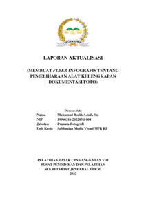 Rodih, Muhamad (2022) Membuat Flyer Infografis Tentang Pemeliharaan Alat Kelengkapan Dokumentasi Foto. Project Report. Pusat Pendidikan dan Pelatihan, Jakarta.